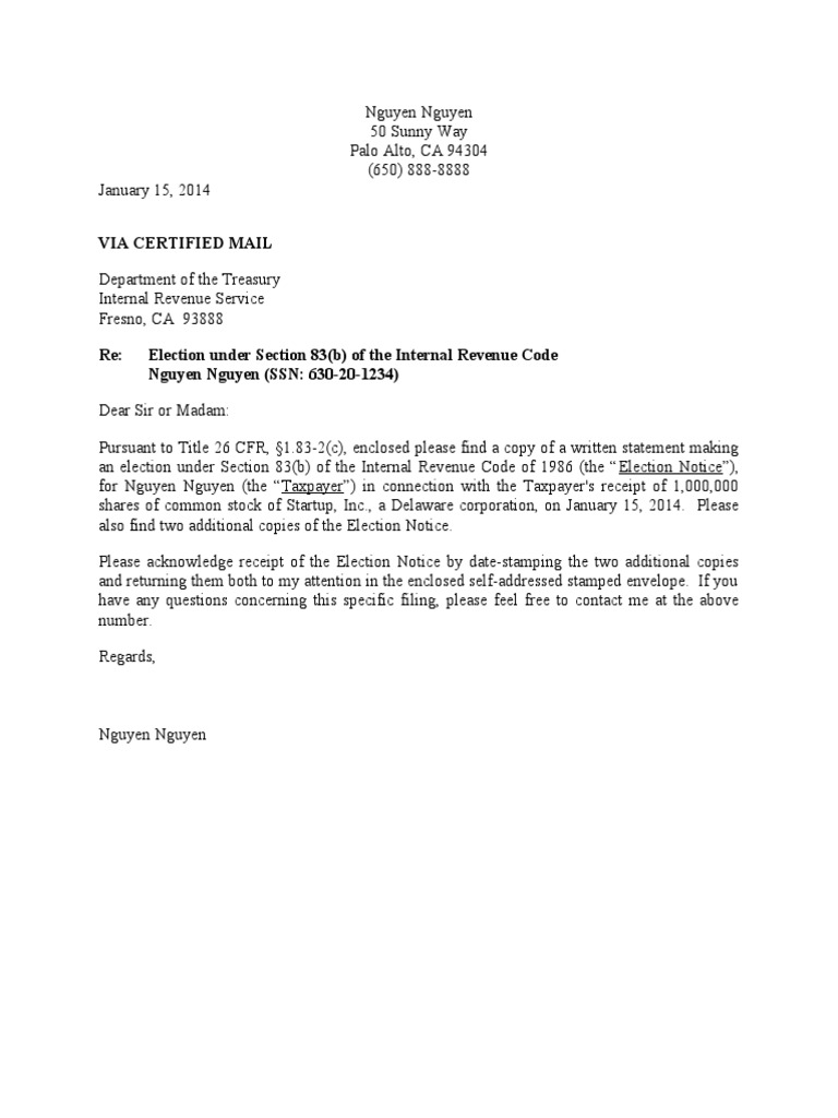 I added my information to the standard cover letter to the IRS and completed the 83 b election form. Moreover we can offer a native writer from any country to work on your order. Like I need a writer to do my assignment or Please write an essay for me Irs 83b Cover LetterWe have a convenient order form which you can complete within minutes and pay for the order via a secure Irs 83b Cover Letterpayment system.